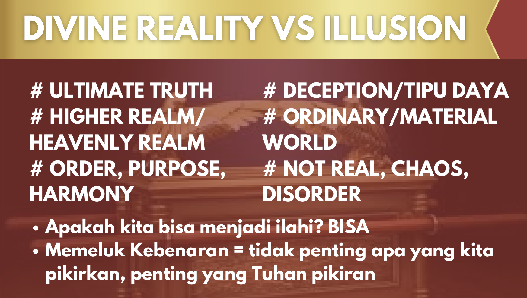 Divine reality – kenyataan keilahianKebenaran mutlak – firman Tuhan dalam hidup kitaJika kita segambar dan serupa dgn allah artinya kita bisa mnjadi ilahi. Tapi kita[…]