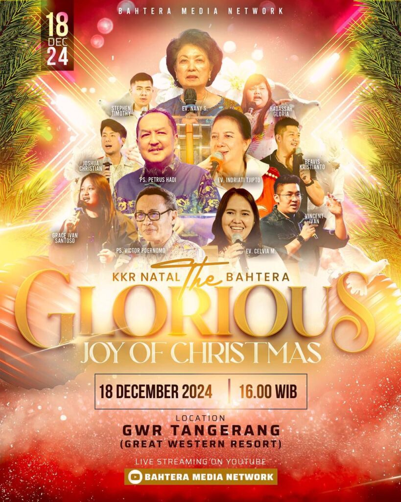 Kami mengundang anda semua untuk menghadiri KKR Natal Bahtera “THE GLORIOUS JOY OF CHRISTMAS”. Acara ini berlangsung pada hari Rabu, 18 Desember 2024. Acara ini diadakan di Great Western Resort.